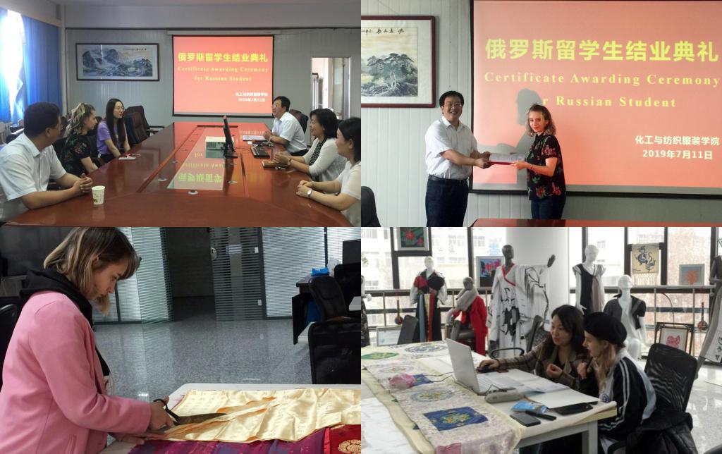 7月10日上午,化工与纺织服装学院举行俄罗斯留学生结业典礼,为来自俄罗斯的Aleksandra Kunitckaia同学颁发结业证书。化工与纺织服装学院党总支书记贾格维、院长赵明威,国际合作与交流中心副主任秦景俊,服装设计教研室主任杨华参加了典礼。