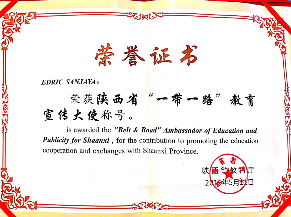 5月11日,由陕西省教育厅主办的“丝绸之路教育合作交流会”于西安举行。我院留学生林义源获得陕西省“一带一路”教育传播大使,教育部国际司副司长李海为林义源同学颁发证书。本次表彰,全省共有14名国际留学生获奖,林义源同学是唯一来自高职院校的外国留学生。
