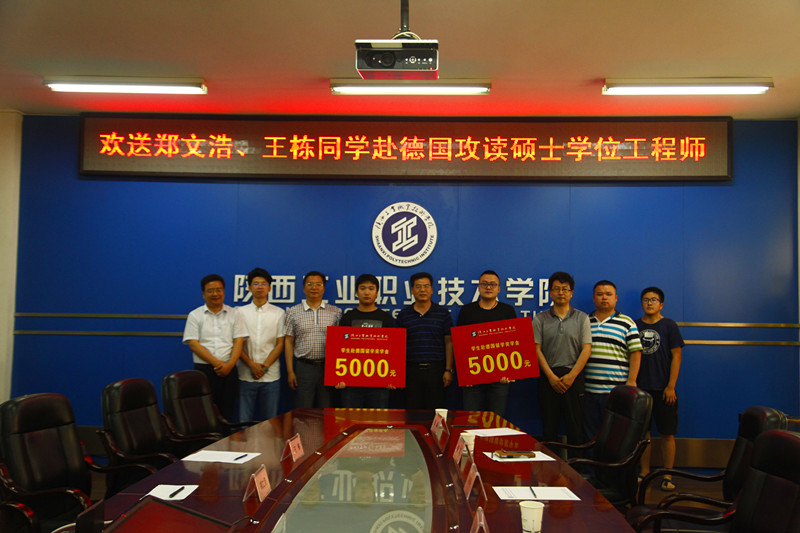 刘永亮对郑文浩、王栋同学即将赴德学习表示祝贺,希望他们继续保持刻苦学习的劲头,尽快适应德国的学习生活环境,顺利完成学业。希望他们时刻铭记自己是陕西工院优秀学生代表,努力成为让学院引以为自豪的学生,成为学院的名片学生。刘永亮还向两位同学分别颁发了5000元人民币的出国留学奖学金。