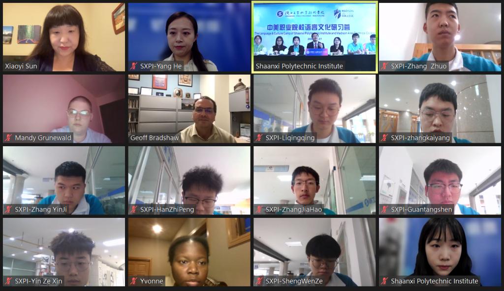 4月28日上午,中美职业院校语言文化研习营以视频会议的形式举行。麦迪逊区技术学院副校长杰夫·布拉德肖博士,汉语教师孙笑怡博士,我校国际教育学院院长秦景俊、教师杨和、梁琳琳,财经与旅游学院商务英语教研室主任郑琳靖副教授,及两校学生代表参加了活动。