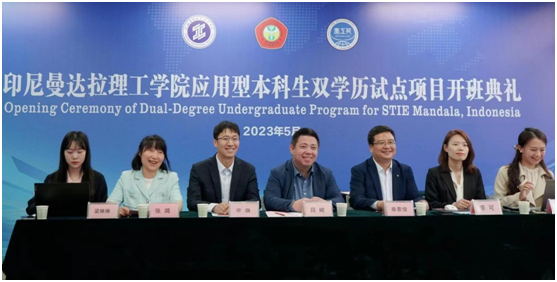 为进一步落实“教随产出,产教同行”,服务企业走出去,5月5日下午,我校印尼秦工苑举行曼达拉理工学院应用型本科生双学历试点项目开班典礼,启动多方联动的印尼本科生联合培养机制。学校副校长段峻、曼达拉理工学院院长苏维尼奥博士,两校师生代表和试点项目21名学员参加了典礼。国际教育学院院长秦景俊主持仪式。
