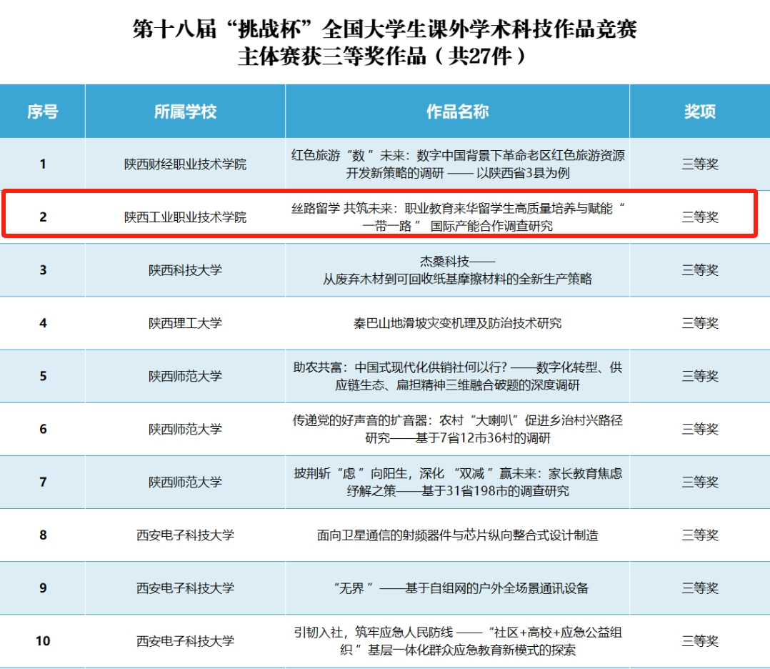 10月30日晚,由共青团中央、中国科协、教育部、中国社会科学院、全国学联和贵州省人民政府主办,贵州大学承办的第十八届“挑战杯”全国大学生课外学术科技作品竞赛终审决赛落下帷幕。我校国际教育学院选送作品《丝路留学 共筑未来:职业教育来华留学生高质量培养与赋能“一带一路”国际产能合作调查研究》荣获主体赛三等奖。