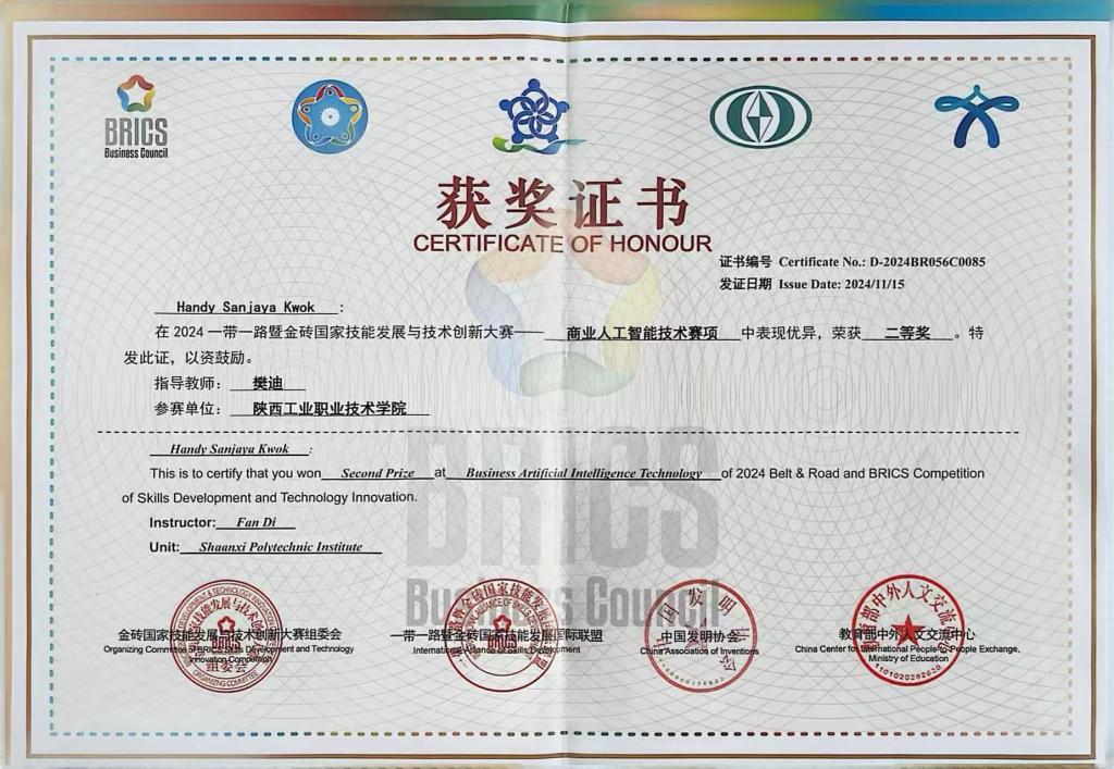 在2024“一带一路”暨金砖国家技能发展与技术创新大赛——商业人工智能赛项中,我校人工智能技术应用专业的印尼籍留学生郭桔汉(Handy Sanjaya Kwok)表现优异,凭借扎实的专业技能和出色的临场发挥,荣获二等奖,为学校争得了荣誉。